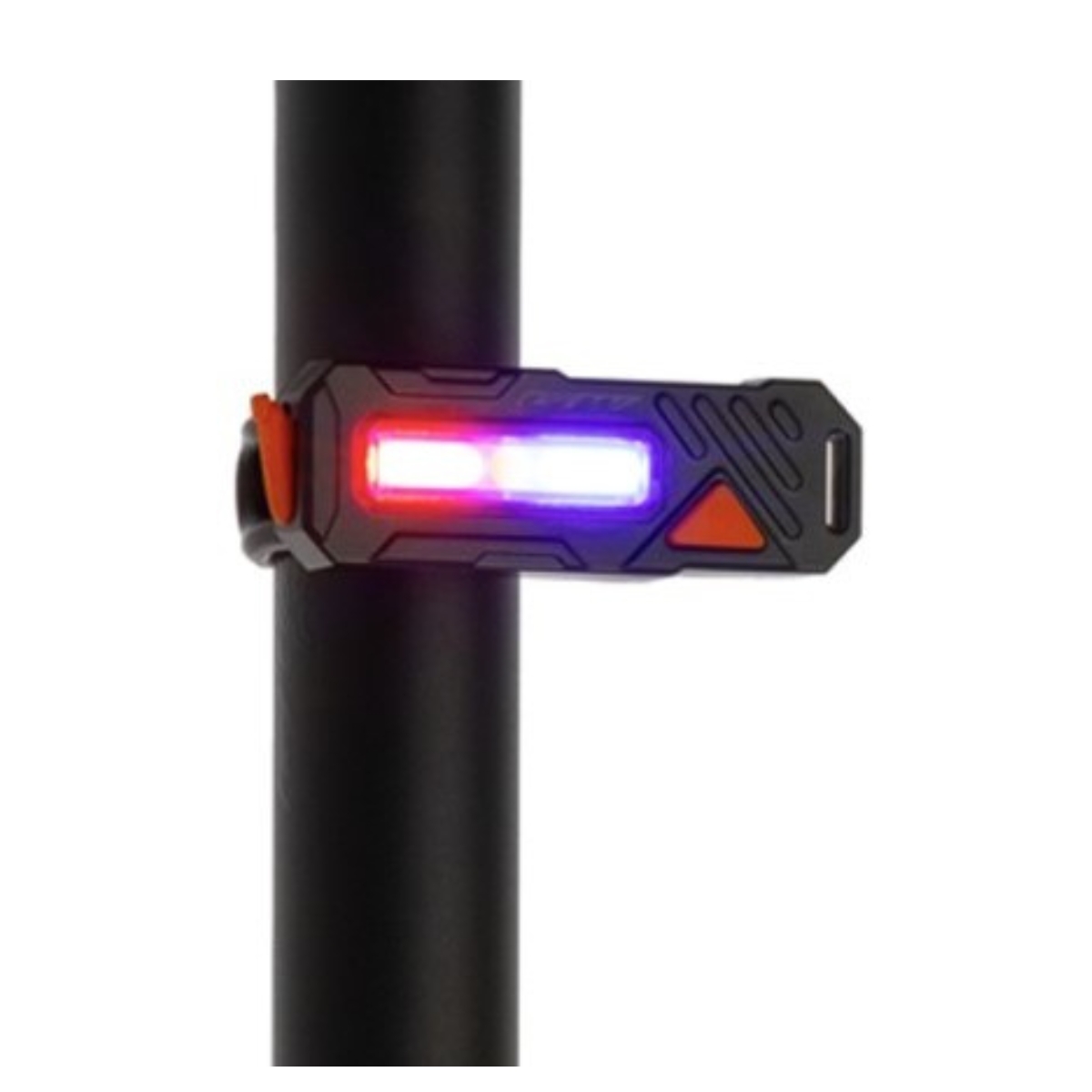Descripción: Luz multifuncional para bicicleta, cobertura de pasta, 5 modos: 3 ROJO/AZUL Flash, Rojo fijo, Azul fijo y 3 modos en luz BLANCA, alto, medio, bajo, carga por cable USB el cual viene incluido, sistema de fijación con abrazadera en caucho y base, resistente al agua.